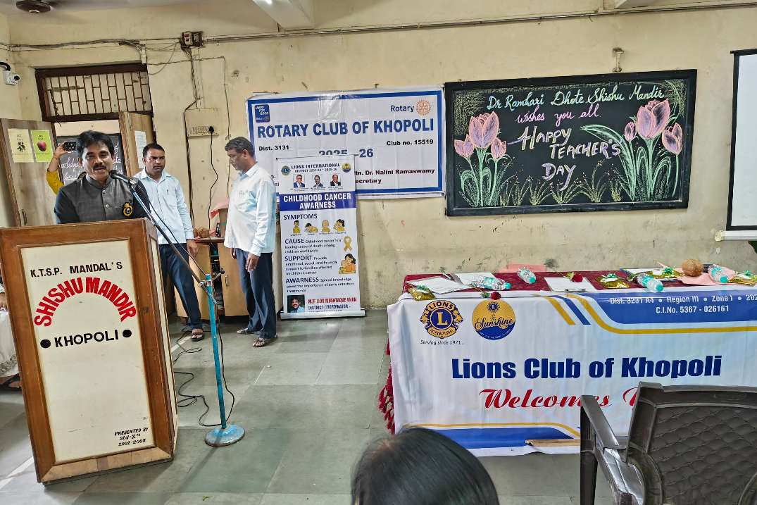 Khopoli Club Reporting We are happy to share that our Teachers’ Day Celebration with distribution of gift to teachers & Childhood Cancer Awareness Program, in association with Rotary Club of Khopoli, was successfully held on 20th September 2025 at Shishu Mandir School. Special thanks to our Faculty – MJF Lion Mushtaq Khan & Rtn. Diwakaran Pillai, and to our Project Chairpersons – 1st VP Lion Shaily Mehta (Lions) & Rtn. President Sunita Madam (Rotary). We sincerely thank all members who attended and contributed to the success of this meaningful joint project.