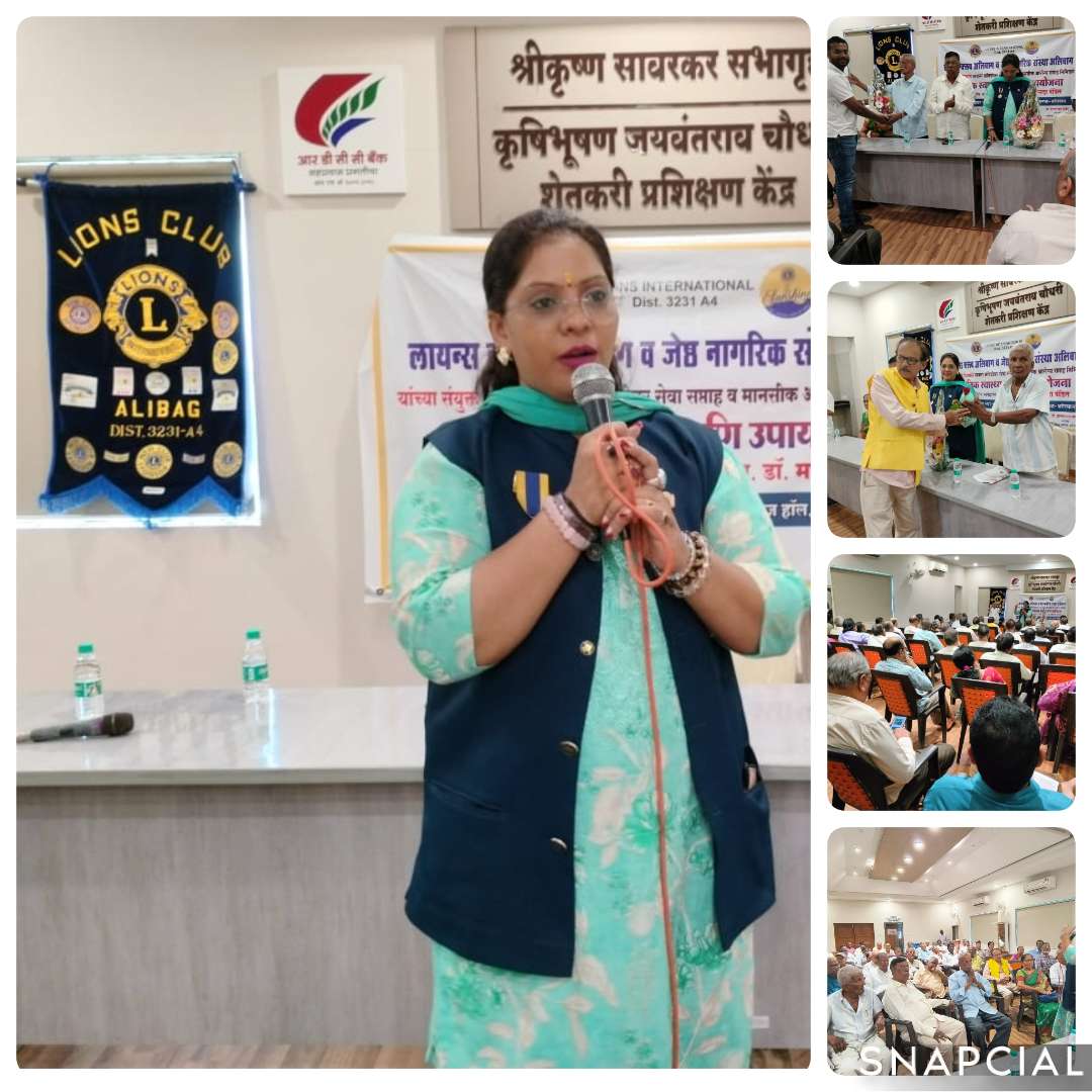 ज्येष्ठ नागरिकांसाठी 'मानसिक स्वास्थ्य आणि उपाययोजना ' या विषयावर ९ ऑक्टोबर रोजी लायन्स क्लब ऑफ अलिबागने क्षात्रैक्य समाजाच्या भव्य सभागृहात मार्गदर्शनपर व्याख्यान आयोजित केले. प्रसिद्ध मानसोपचारतज्ज्ञ मानदा पंडित यांनी ज्येष्ठ नागरिक, लायन सभासद आणि उपस्थित इतर अशा साधारण एकशे पंचवीस श्रोत्यांना दोन तास मंत्रमुग्ध केले. यावेळी अध्यक्ष प्रदीप नाईक, अमोघ किंजवडेकर, महेंद्र पाटील, संतोष पाटील, क्षात्रैक्य समाज अध्यक्ष अलिबाग द्वारकानाथ नाईक आणि इतर लायन मेंबर्स उपस्थित होते.
