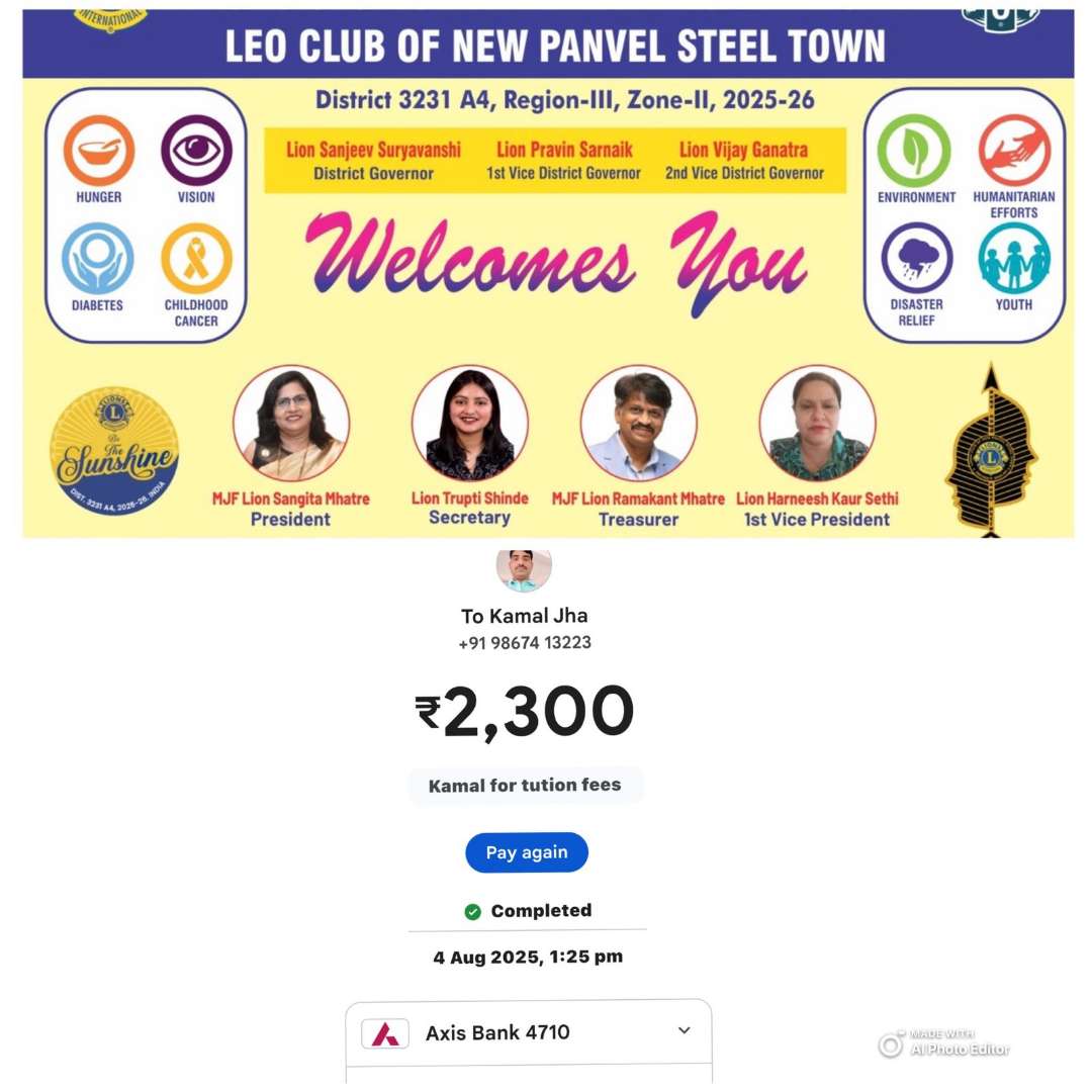 Sponsored Rs 2300/- Ln Minakshi Bhatnagar (IMPP) for Tuition Fees of Master Prakash & Master Suhas