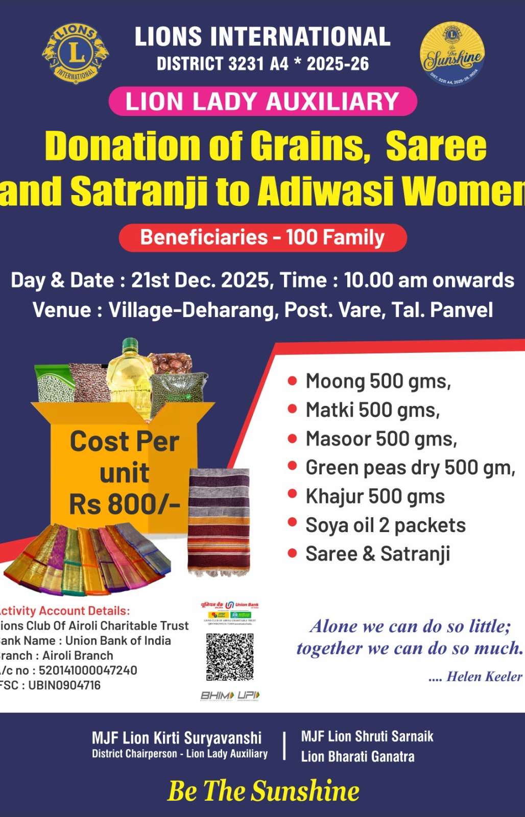 Participated in donation of grains, saree and satranji to adiwasi women, activity organised by Lion Lady Auxiliary