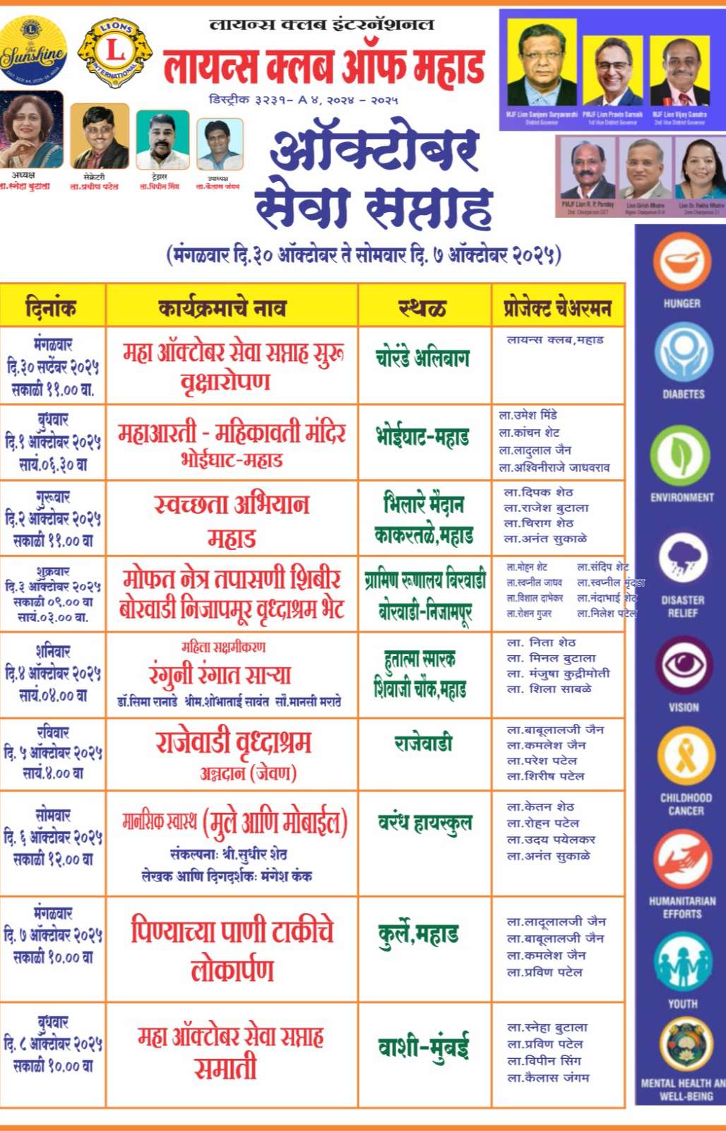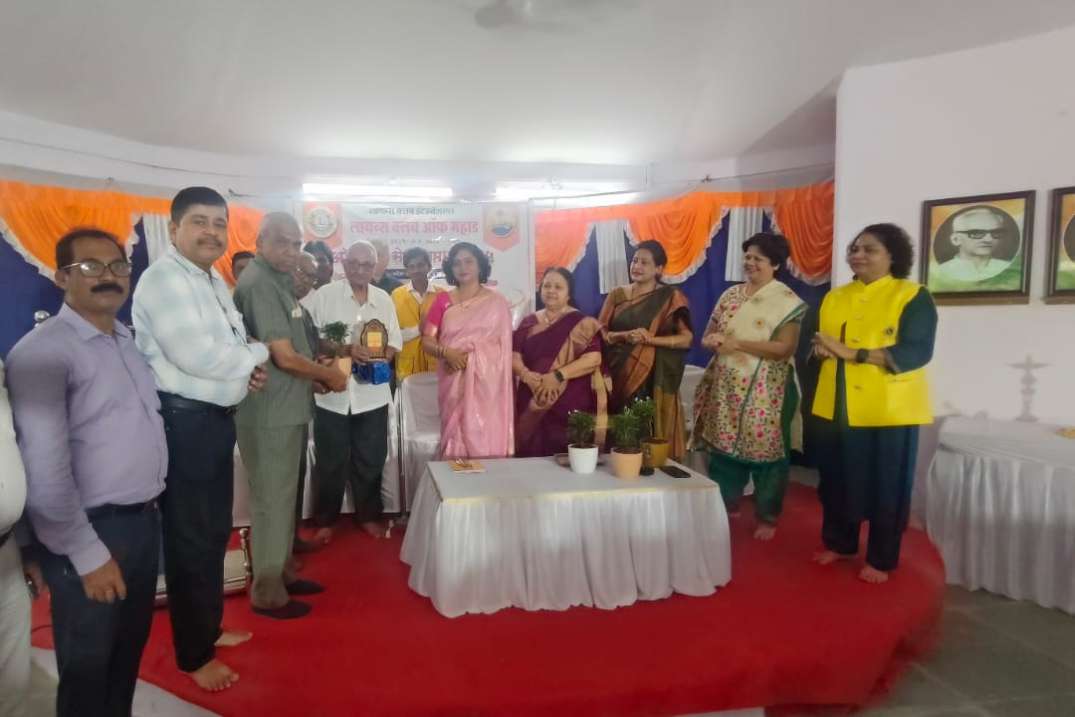 Lion's club Mahad organized 9 activities serving 4000 people including students 1) Environment - Cleaning involving CO of Municipality and Police 2) Social - Food distribution to needy and elderly people 3) Visited Nijampur old age home and provided groceries for a month's requirement 3) Education - School visit for awareness regarding mobile usage - pros and cons - attended by 600 students - Audio video session 4) Dr. Seema Ranade session on Women's empowerment at Hutatma Smarak, Mahad 5) Organized a live show regarding mood changes in Women's life 6) Felicitation of Senior most Lion's members - Kanubhai Shah and Shobha Tai Sawant, Dr. Suryakant Sheth and many others 7) Tree plantation at Alibaug 8) Eye checkup at Birwadi PSU - 400 patients and 40 cataract operations done