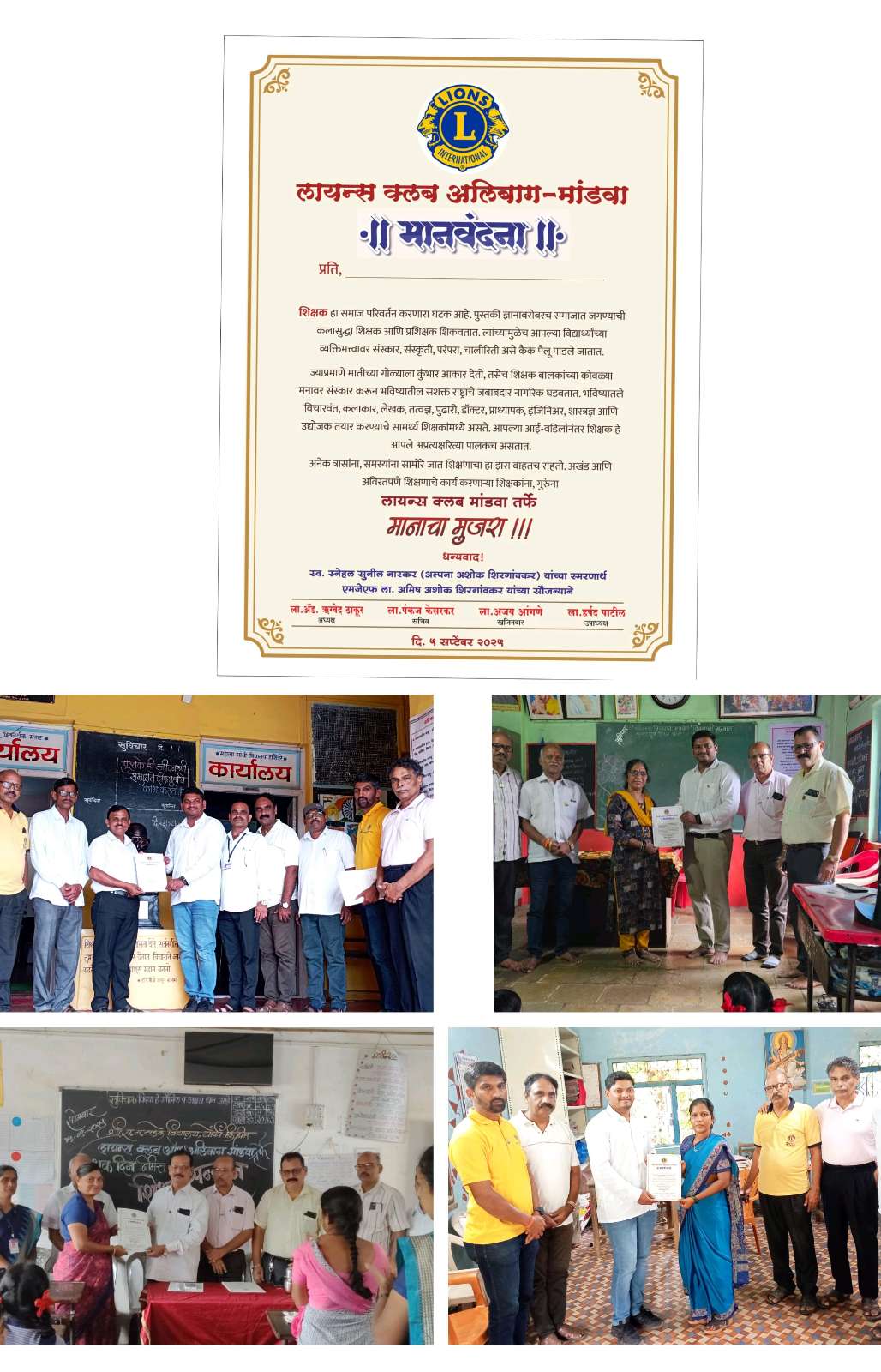 📖✨ Teacher’s Day Special Felicitation ✨📖 Lions Club of Alibag – Mandwa To express heartfelt gratitude towards the noble teachers who illuminate society with the light of knowledge, Lions Club of Alibag – Mandwa organized a grand “Teachers’ Felicitation Ceremony” on the occasion of Teachers’ Day, 05th September 2025. The program was conducted on the 8th, 9th, and 15th of September 2025 across different schools with great enthusiasm. In this special event, in loving memory of Late Snehal Sunil Narakar (Alpana Ashok Shirgaonkar) and through the courtesy of MJF Ln. Amish Ashok Shirgaonkar, a “Manavandana” Appreciation Certificate was presented. On behalf of Lions Club of Alibag – Mandwa, distinguished teachers from various schools were felicitated with the “Manavandana” Certificate, honoring their invaluable contribution to society.