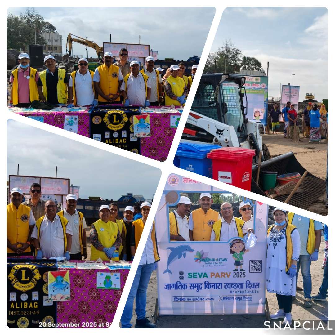जागतिक समुद्र किनारा स्वच्छतादिन जागतिक समुद्र किनारा स्वच्छतादिनाच्या औचित्याने शनिवार, दिनांक २०सप्टेंबर, २०२५रोजी सकाळी ठीक ८:०० वाजता अलिबाग बीचवर चाळीसहून अधिक लायन मेंबर्स उपस्थित होते. यावेळी उद्घाटनपर कार्यक्रमानंतर हँडग्लोज घालून, हातात झाडू, फावडे, बकेट ही आवश्यक साधने घेऊन, संपूर्ण किनारा स्वच्छ करण्यासाठी एकवटले. त्यांच्या सोबत अलिबाग नगरपरिषदेचे कर्मचारी आणि इतरही अनेकजण होते. प्रमुख उपस्थितांमध्ये जिल्हाधिकारी डॉ किशन जावळे, जिल्हा परिषदेच्या मुख्य कार्यकारी अधिकारी डॉ नेहा भोसले, लायन्स क्लब ऑफ अलिबागचे अध्यक्ष प्रदीप नाईक, सचिव महेश कवळे, खजिनदार अमोघ किंजवडेकर, लायन अनिल म्हात्रे, नयन कवळे, भगवान मालपाणी,गिरीश म्हात्रे, गौरी म्हात्रे,प्रकाश देशमुख, रोहन पाटील ,ढगे आदी उपस्थित होते.