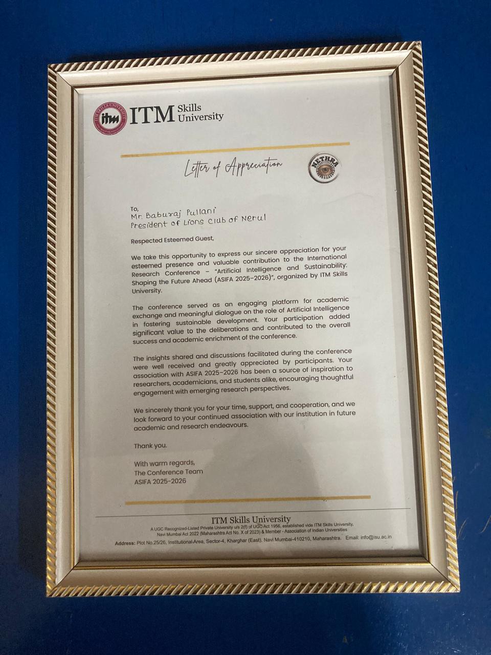 Lions club of Nerul received s letter of appreciation from ITM