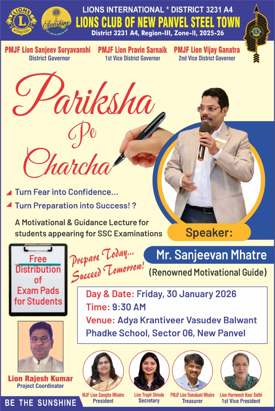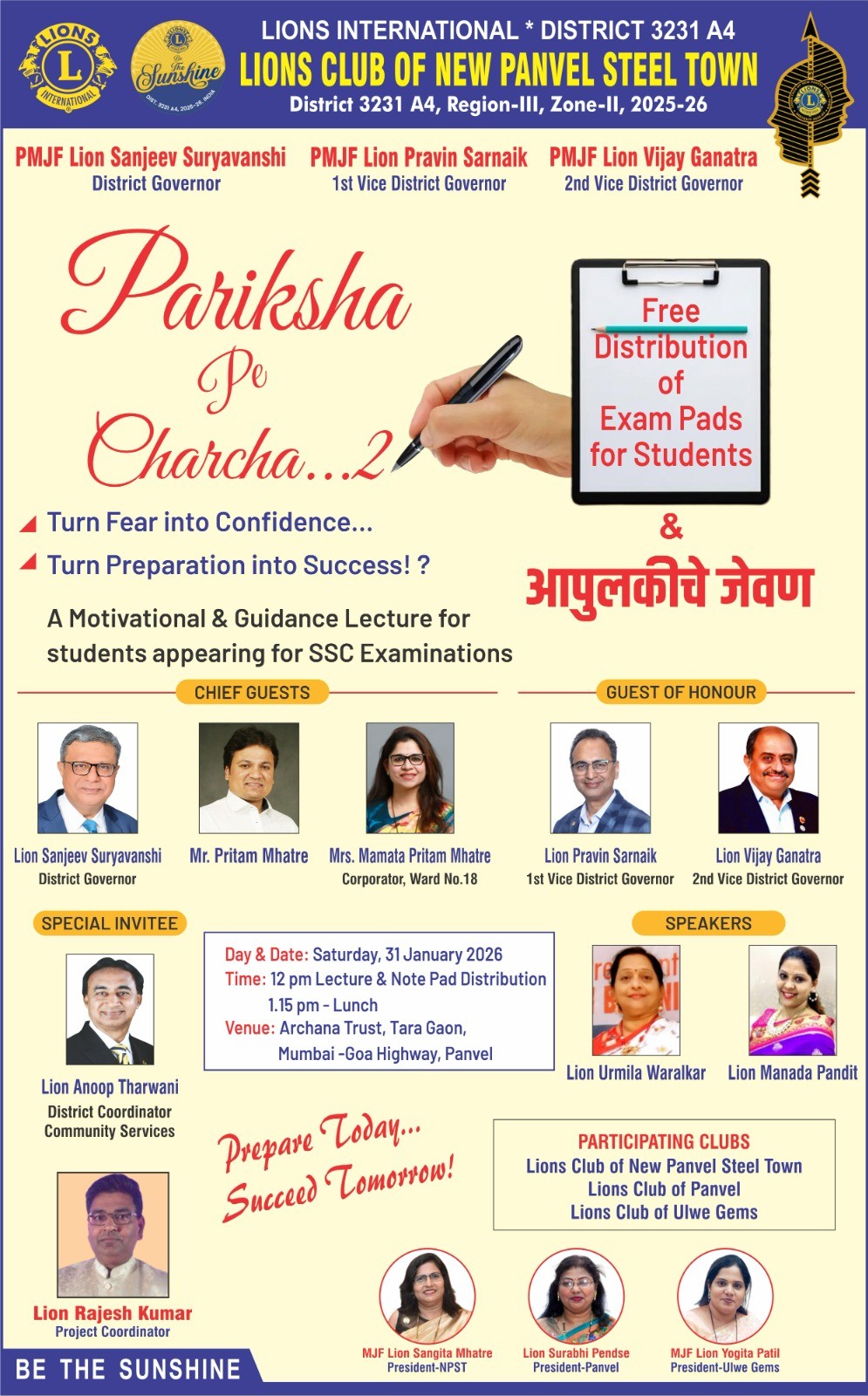 एग्जाम के दिनों में बच्चों को कितने टेंशन रहती है उसकी थोड़े से रिलीफ के लिए लायंस क्लब न्यू पनवेल स्टील टाउन द्वारा अच्छा काम किया है आप सभी से निवेदन है कि इस इस प्रोग्राम में ज्यादा से ज्यादा मेंबर प्रेजेंट रहे ज्यादा दूर जाने की भी जरूरत नहीं है यह प्रोग्राम पनवेल में ही है