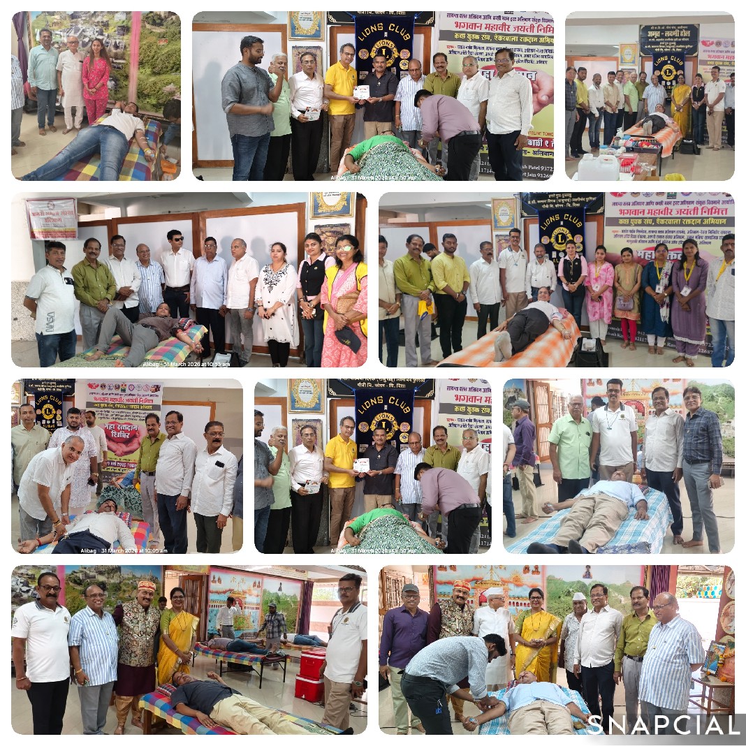 महावीर जयंतीच्या औचित्याने महारक्तदान शिबीराचे आयोजन अलिबाग, दिनांक ३१ लायन्स क्लब ऑफ अलिबाग आणि कच्छी भवन ट्रस्ट अलिबाग यांच्या संयुक्त विद्यमाने महारक्तदान शिबिराचे कच्छी भवनयेथे आयोजन करण्यात आले. लायन्स क्लब ऑफ अलिबागसह प्रशांत नाईक मित्रमंडळ, डायमंड अलिबाग, अलिबाग रेवस मिनीडोअर संघटना, ऑटोरिक्षा संघटना, आगरी समाज संस्था, उज्ज्वल भविष्य सामाजिक संस्था, माणुसकी प्रतिष्ठान, मुंबई कॉलेज ऑफ हॉटेल मॅनेजमेंट यांचा सहभागाने कच्छ युवक संघ एंकरवाला रक्तदान अभियानात मोठ्या प्रमाणावर रक्त संकलनाचे उद्दिष्ट डोळ्यासमोर ठेवण्यात आले. यावेळी उत्कृष्ट प्रतिसाद मिळाला असून एकूण १६५ रक्तदात्यांनी रक्तदान करुन, तेवढ्याच संख्येने रक्त संकलित केले. यावेळी प्रमुख उपस्थितांमध्ये अलिबाग नगराध्यक्षा अक्षया नाईक, उपनगराध्यक्षा ॲड मानसी म्हात्रे, लायन्स क्लब ऑफ अलिबागचे अध्यक्ष तथा नगरसेवक प्रदीप नाईक, फर्स्ट डिस्ट्रिक्ट गव्हर्नर लायन प्रवीण सरनाईक, ज्येष्ठ लायन कांतिलाल शहा , रिजन चेअरपर्सन गिरीश म्हात्रे, सेक्रेटरी महेश कवळे, खजिनदार अमोघ किंजवडेकर, डिस्ट्रिक्ट कोऑर्डिनेटर लायन नयन कवळे, रणजित जैन, भावेश पटेल , धर्मेश देढिया, महेंद्र पाटील, अविनाश राऊळ, ॲड गौरी म्हात्रे, संतोष पाटील, भगवान मालपाणी, नितीन शेडगे, समीर कवळे, मिलिंद मगर, मेहुल पाटील, डॉ नितीन गांधी, संजय माळी, प्रकाश कवळे, अनिल आगाशे, विकास घरत, उज्ज्वला चंदनशिव, जिल्हा रक्त संक्रमण अधिकारी डॉ गोसावी यांच्यासह लायन्स अलिबाग आणि कच्छी भवनचे सदस्य , रक्तदाते मोठ्या संख्येने उपस्थित होते.